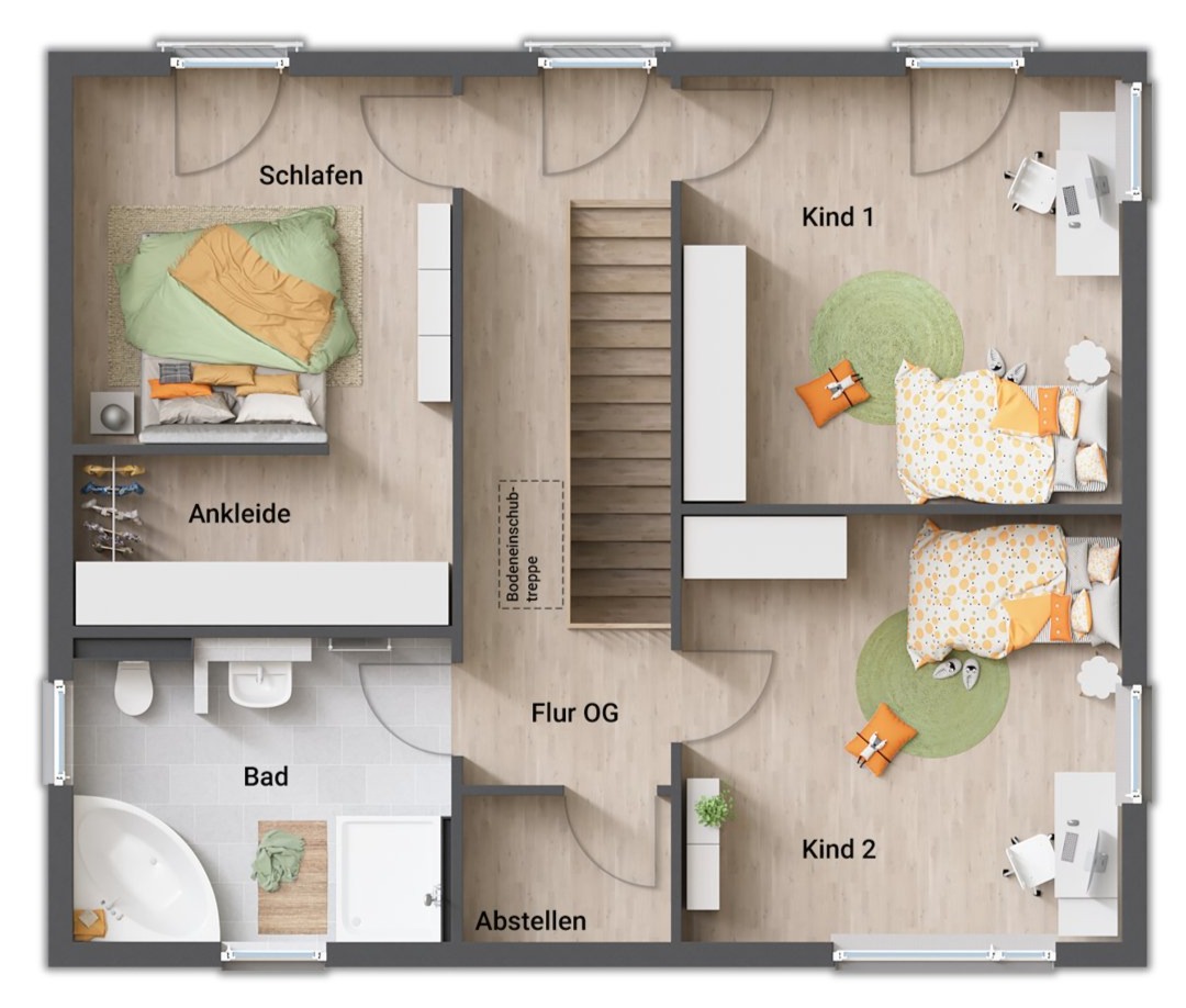 - Eltern- und Kinderbereich im Obergeschoss getrennt durch den Flur