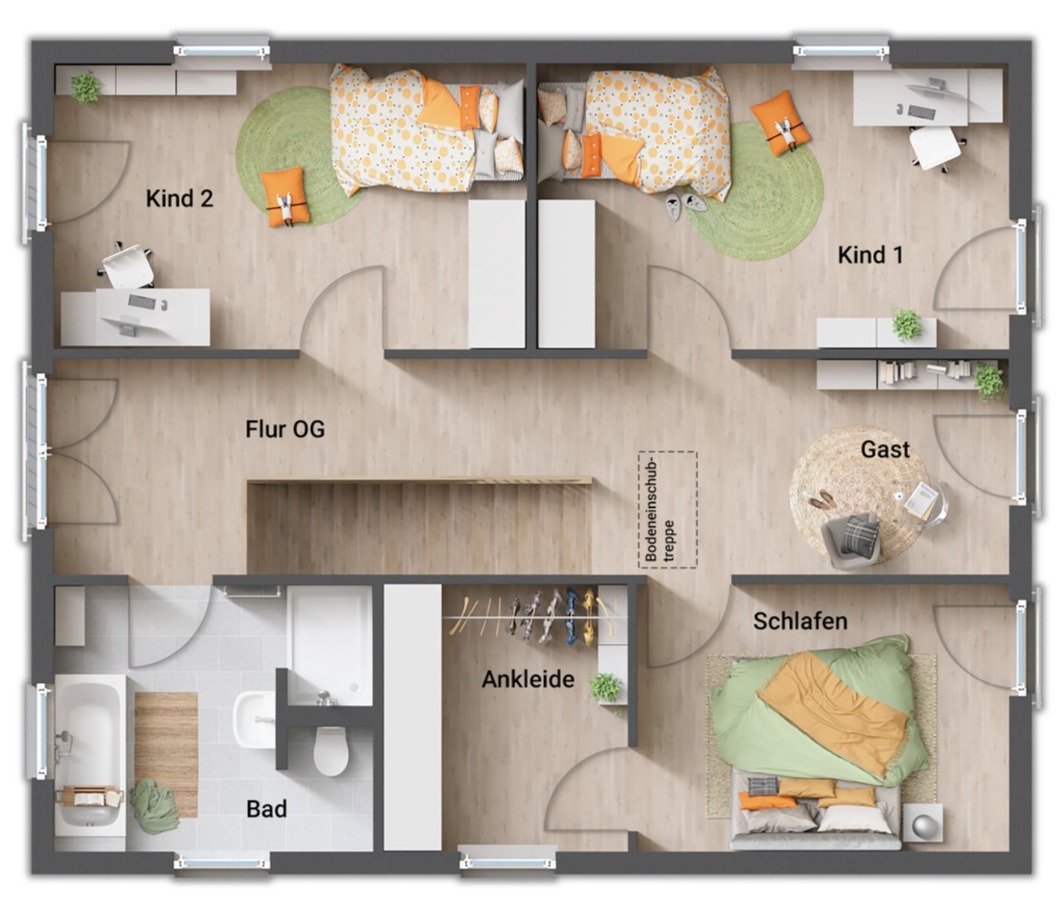 Auch das Obergeschoss zeigt sich im gradlinigen Baustil des Hauses. Hier finden Sie drei Zimmer, die Sie nach Ihren Vorstellungen als Schlaf-, Kinder- oder Gästezimmer nutzen können. Große Fenster lassen auch hier viel Tageslicht hineinströmen. Die Ankleide im Schlafzimmer bietet viel Stauraum.